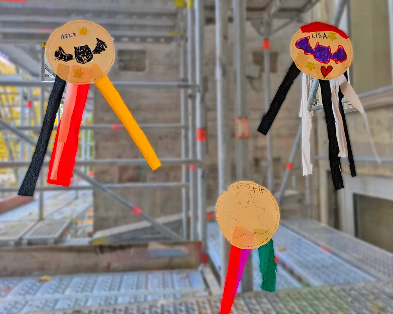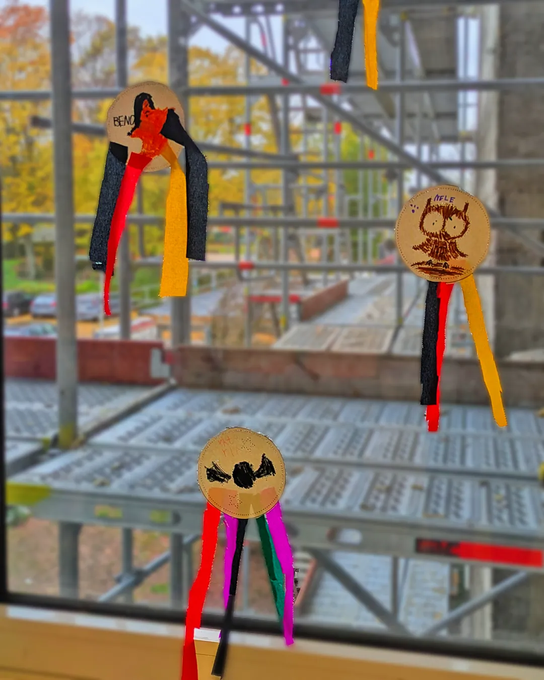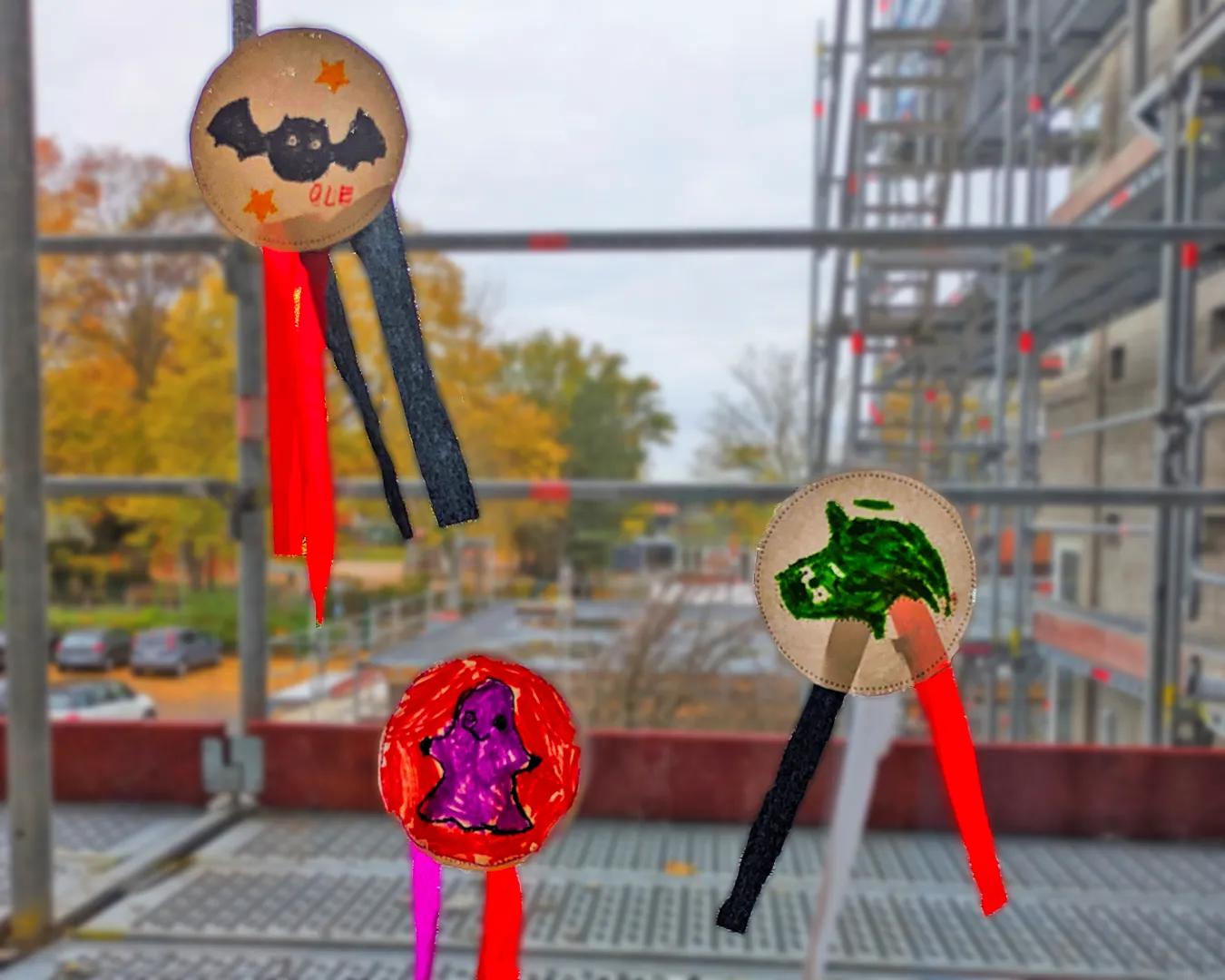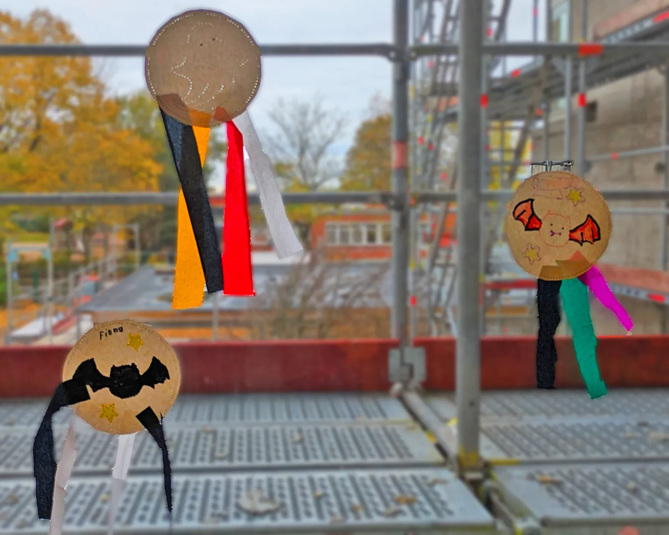Halloweenschmuck hängt an dem Gerüst vor den Fenstern der Klasse.