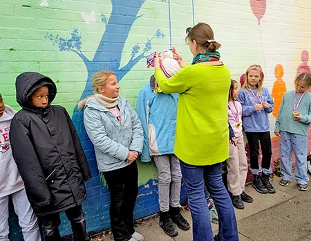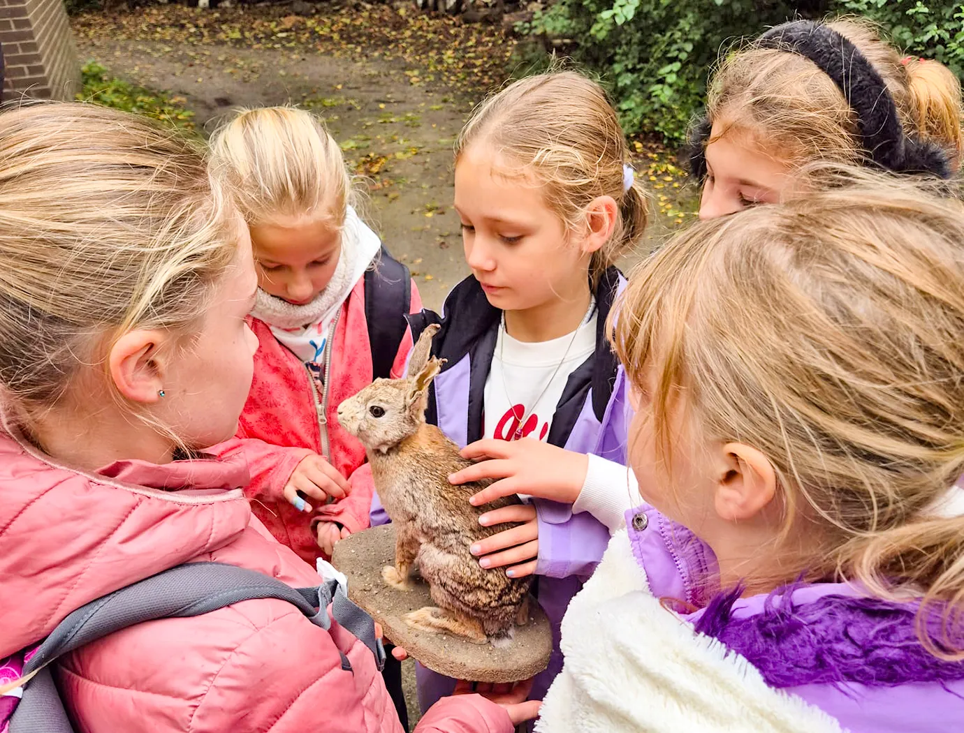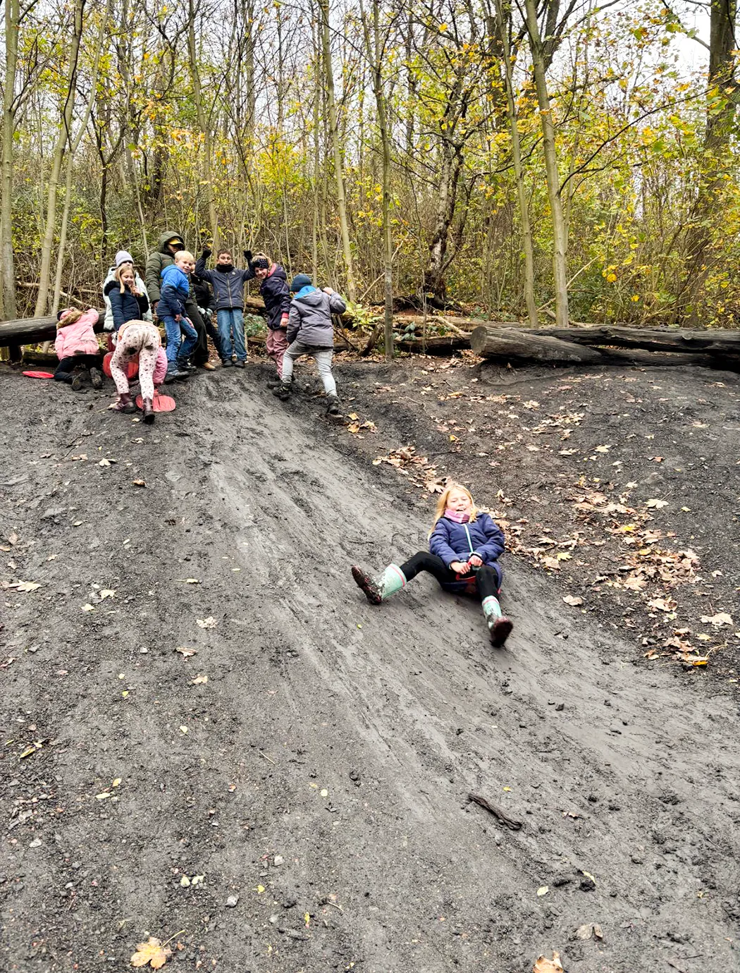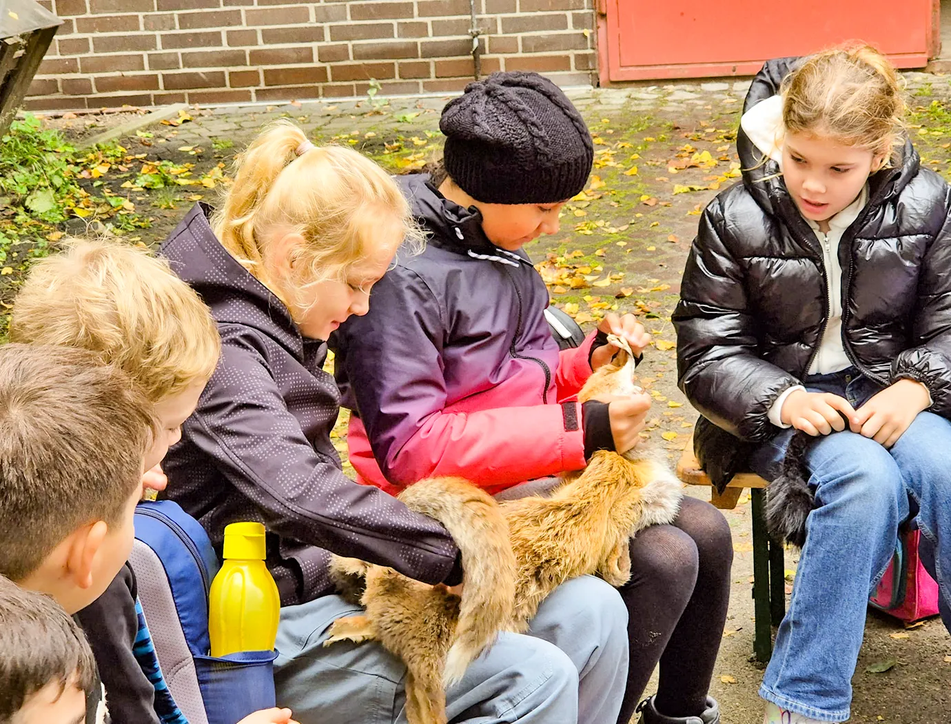 Schülerinnen der 4. Klassen sitzen im Kreis auf dem Anwesen des Forsthauses und betrachten und berühren ausgestopfte Tiere. Sie rutschen auf Brettern einen Matschhügel hinunter.