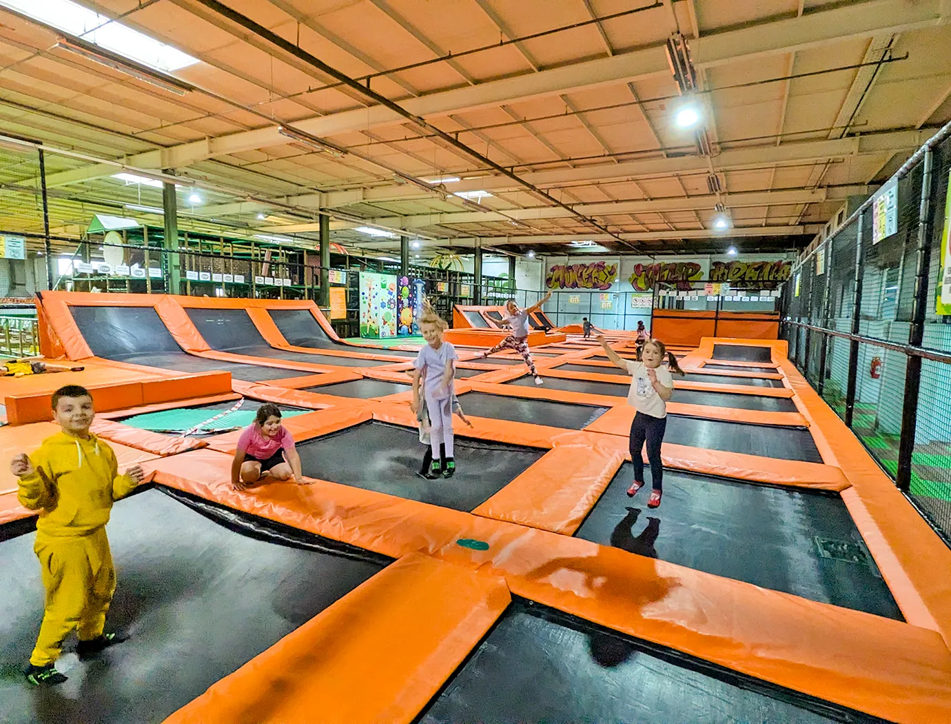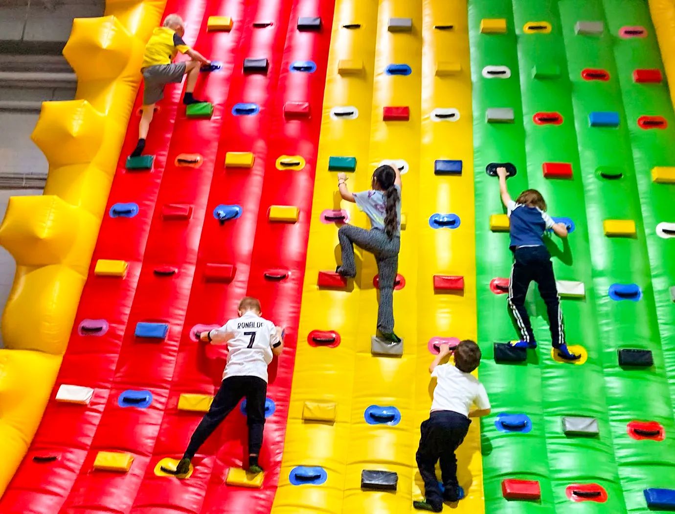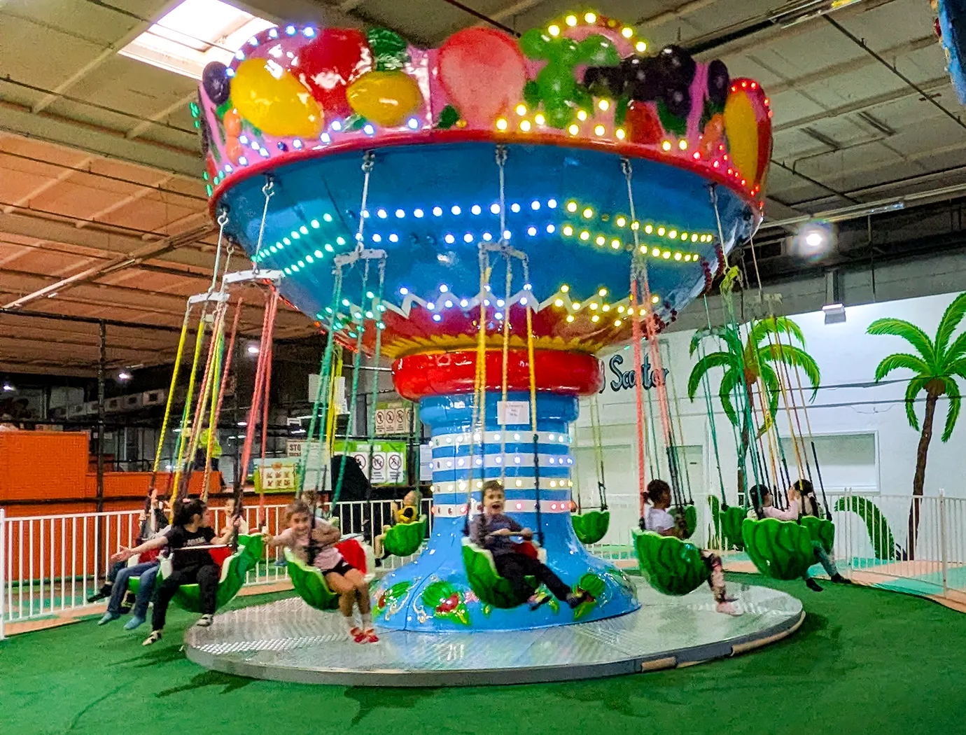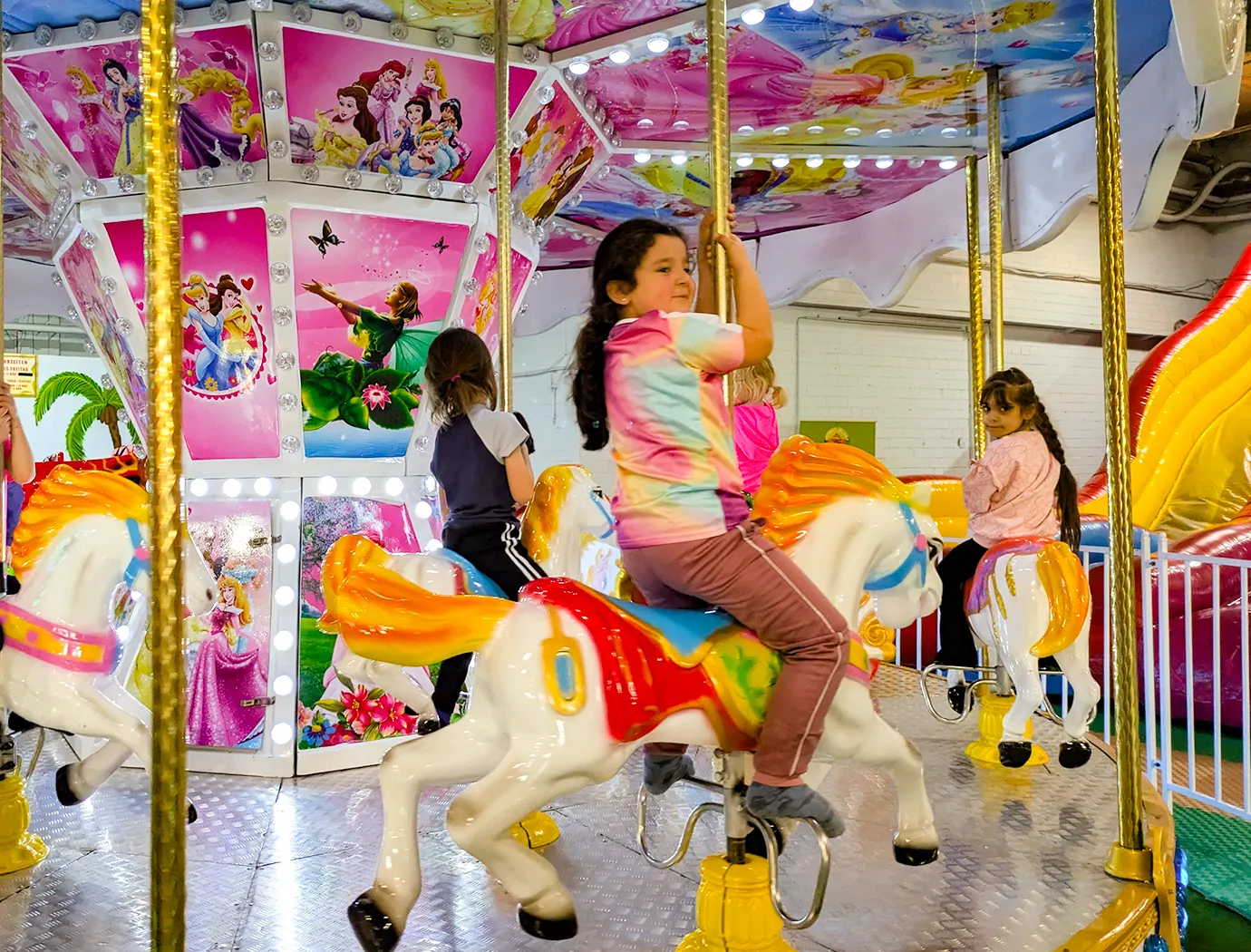 Kinder sitzen auf den Fahrgeschäften bzw. toben auf den Sprungmatten des Money Island