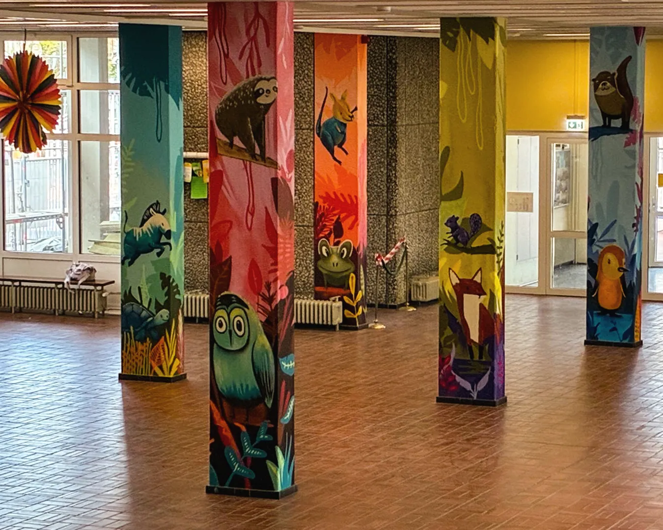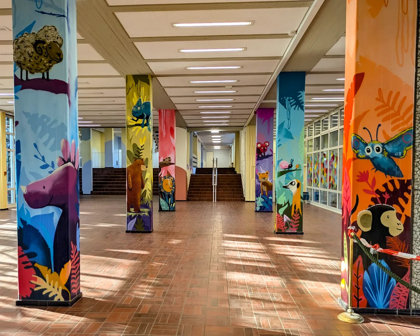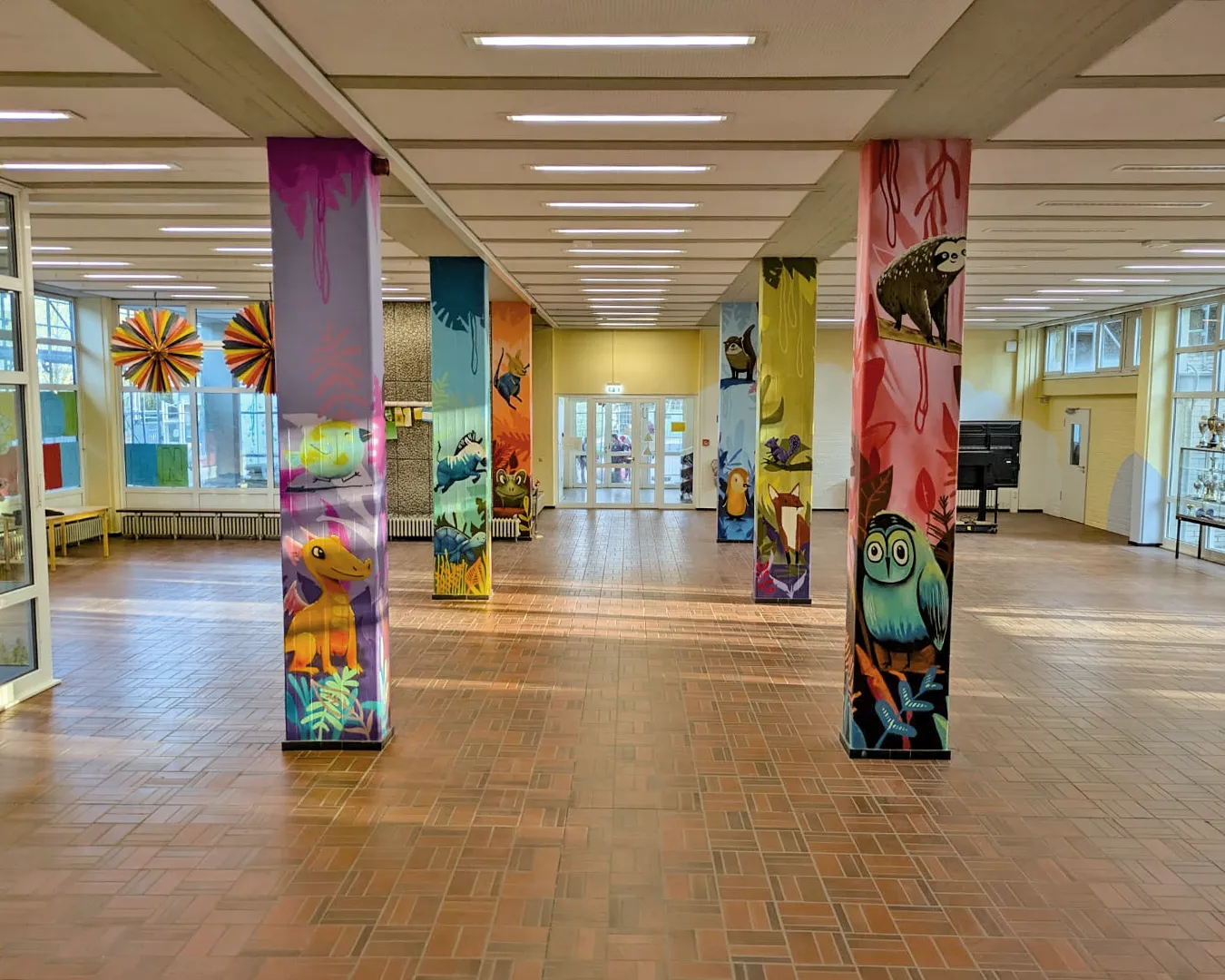 Die Säulen in unserer Eingangshalle sind nun fertig und geben dem oft als Aula genutzten Raum ein fröhliches und frisches Aussehen. Verschwunden sind die grauen Säulen und nun sieht man auch erst richtig, wie schön die großen Fenster auf allen Seiten den Eingangsbereich erhellen