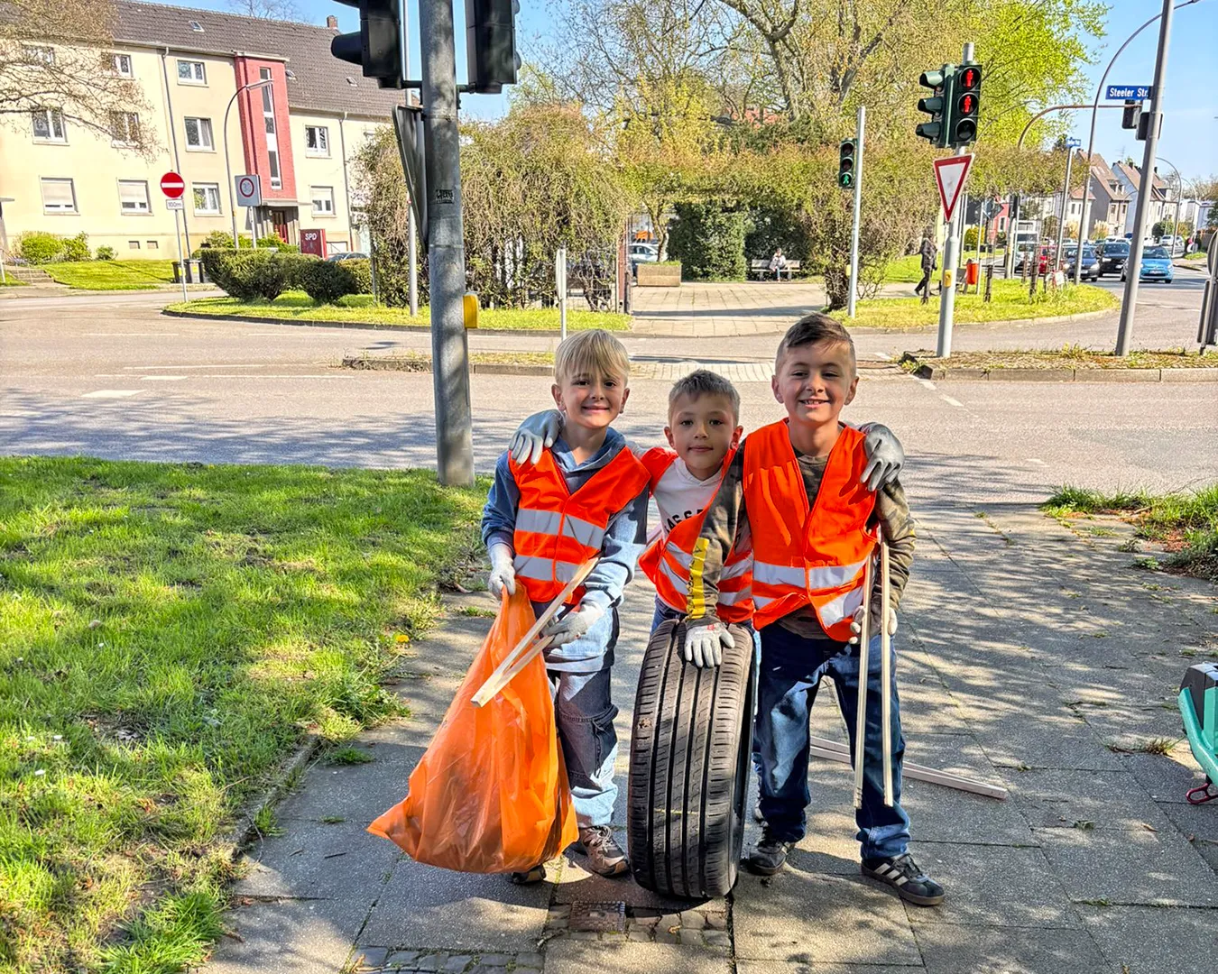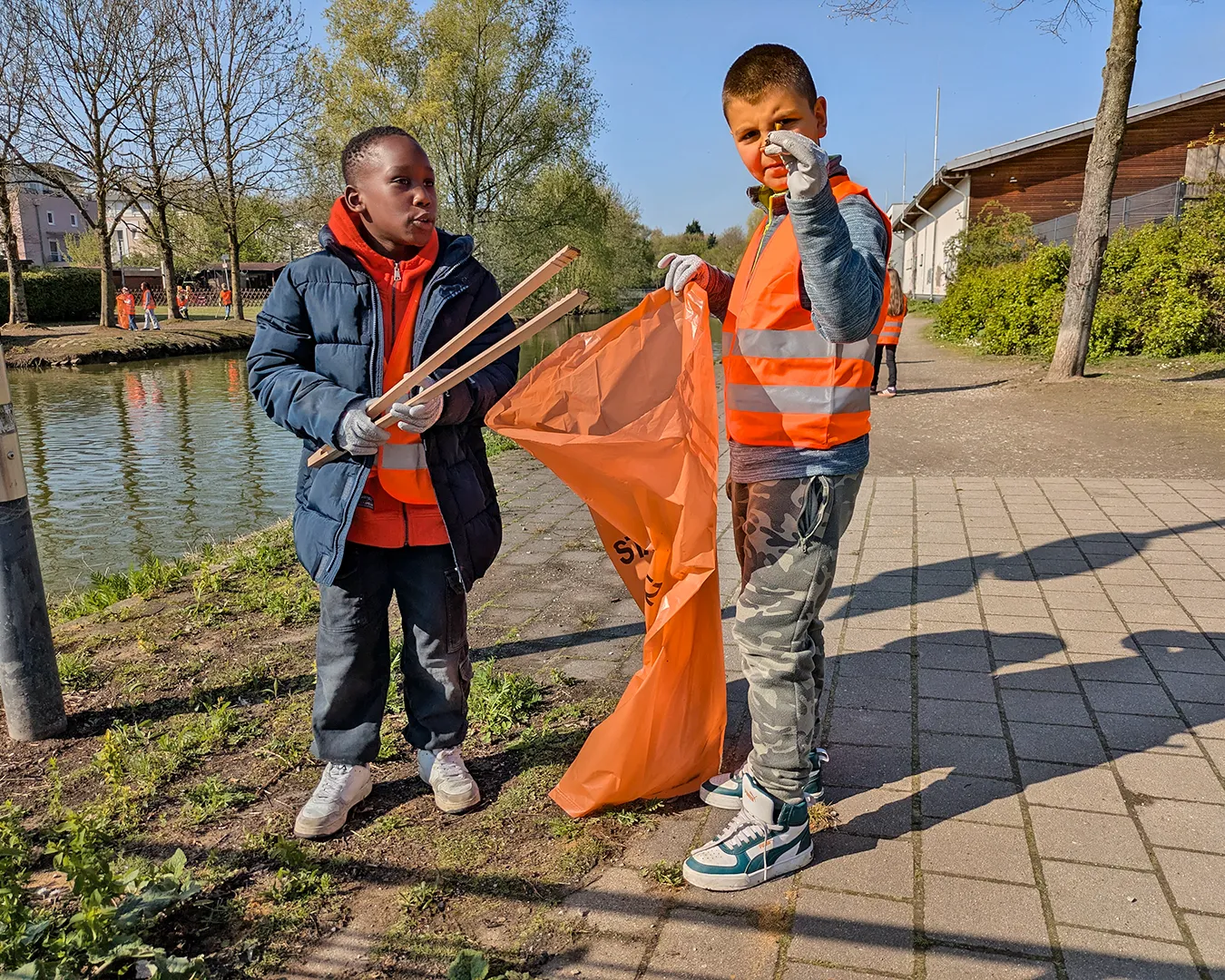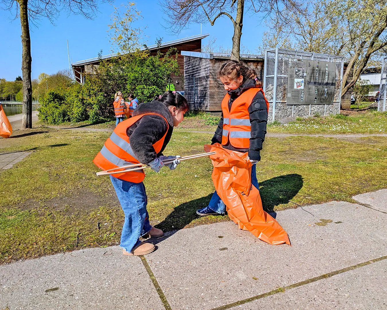 Kinder der Schule sammeln Müll aus Grünanlagen im Stadtteil. Sie tragen dabei Sicherheitswesten und benutzen Sammelwerkzeuge.
