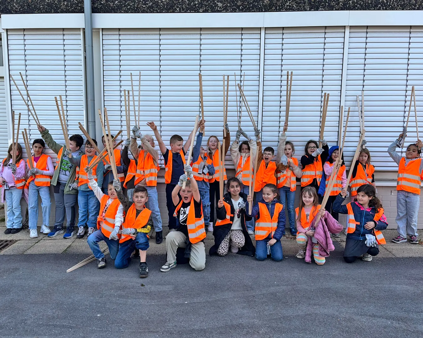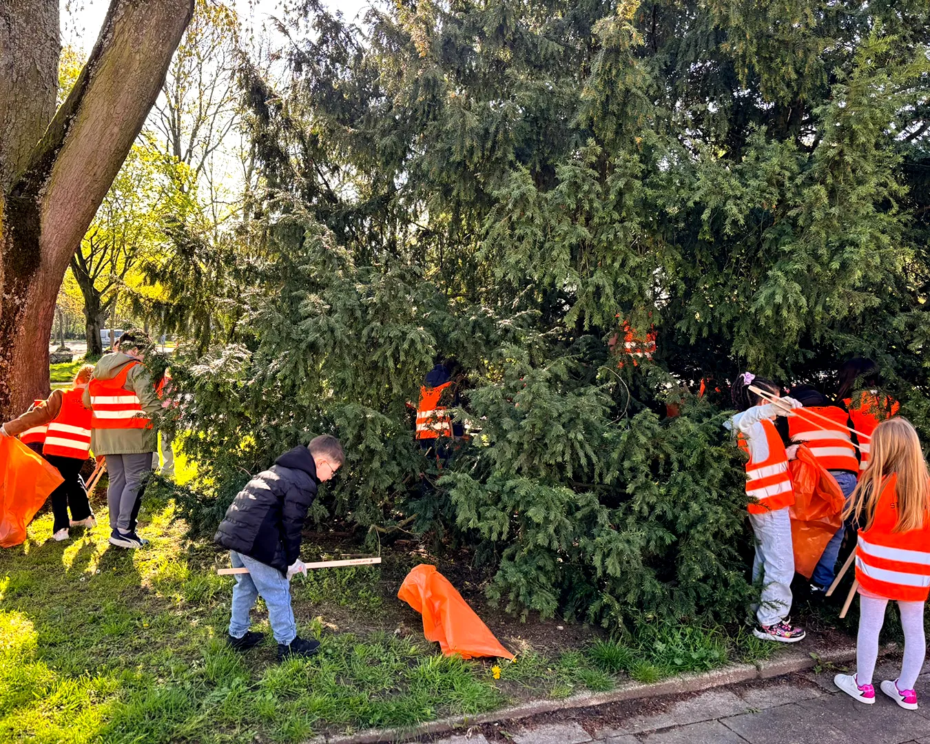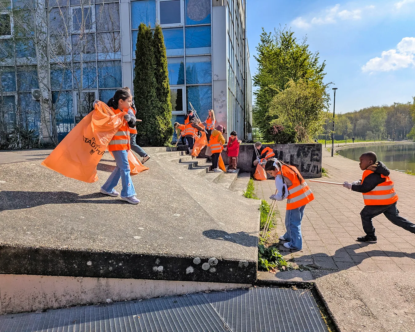 Kinder der Schule sammeln Müll aus Grünanlagen im Stadtteil. Sie tragen dabei Sicherheitswesten und benutzen Sammelwerkzeuge.