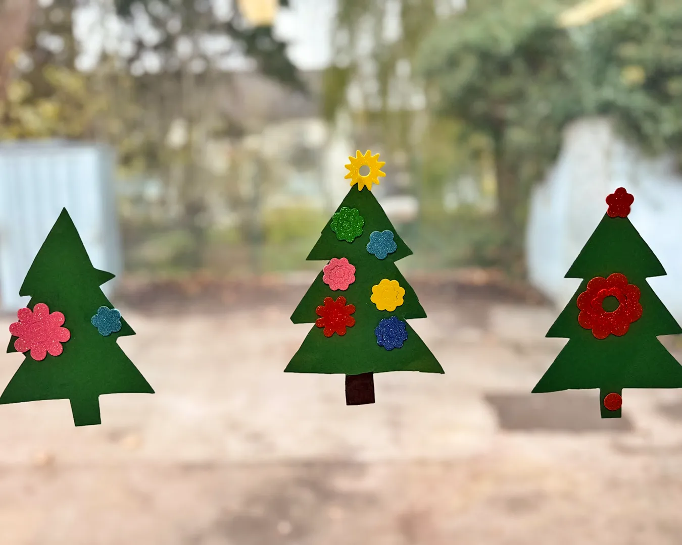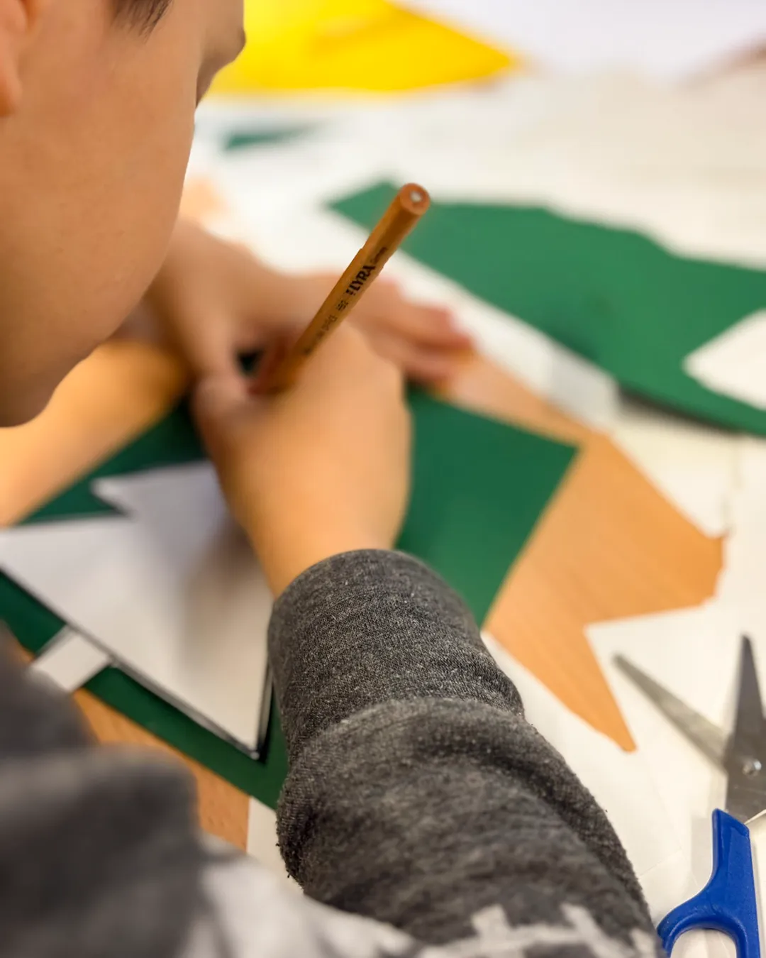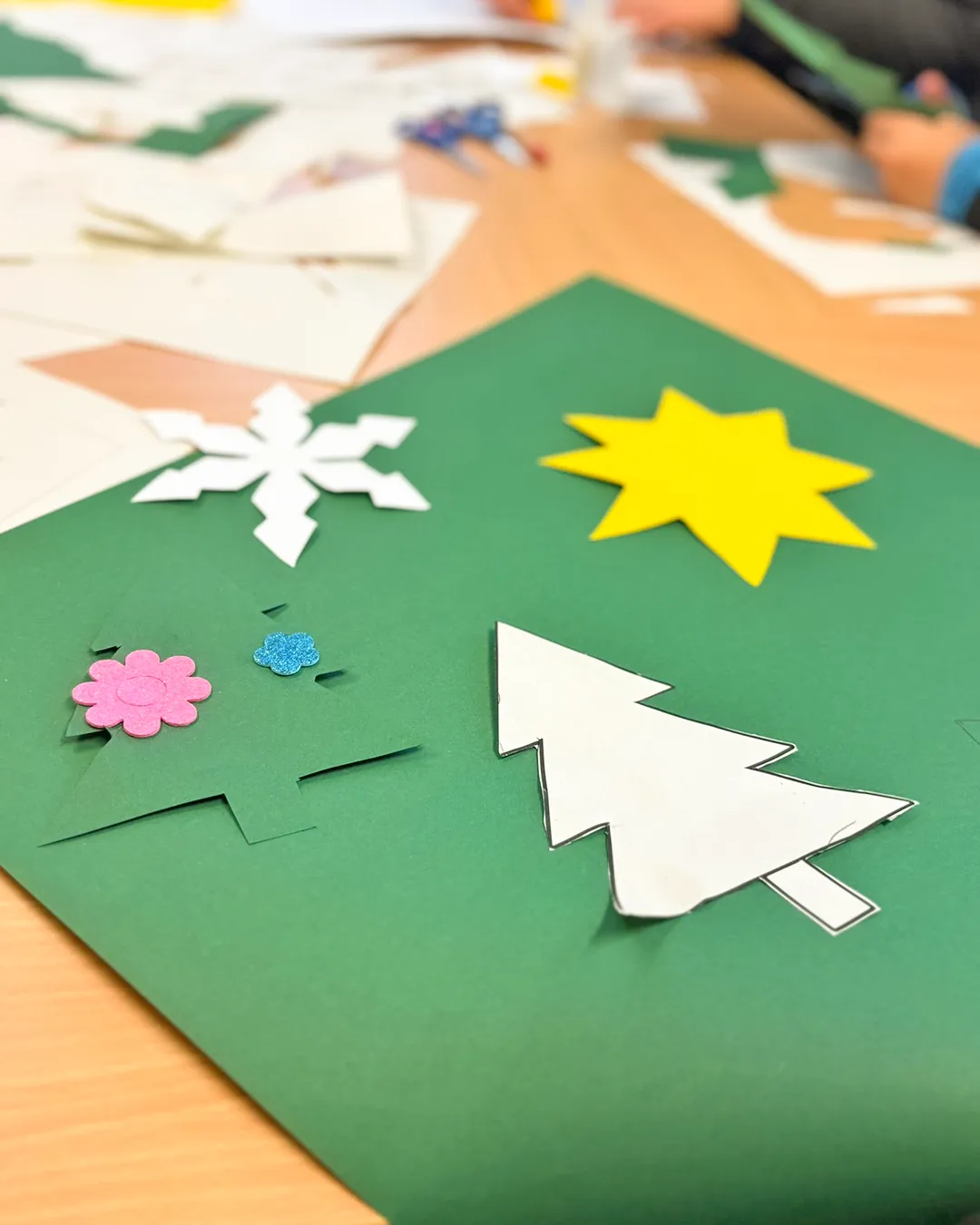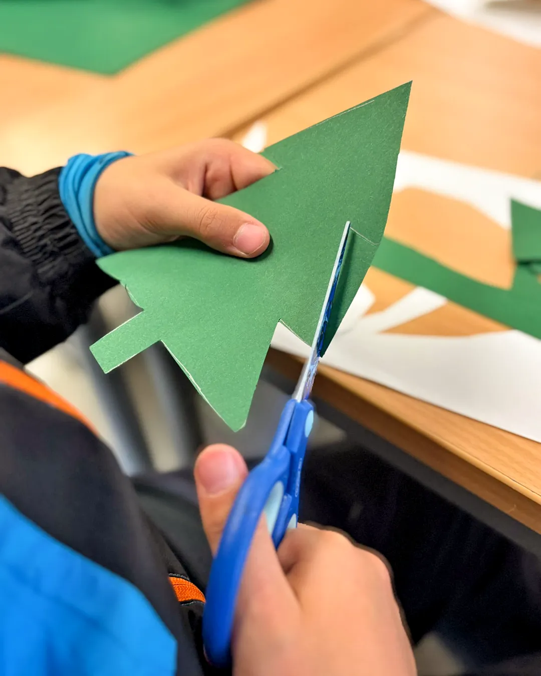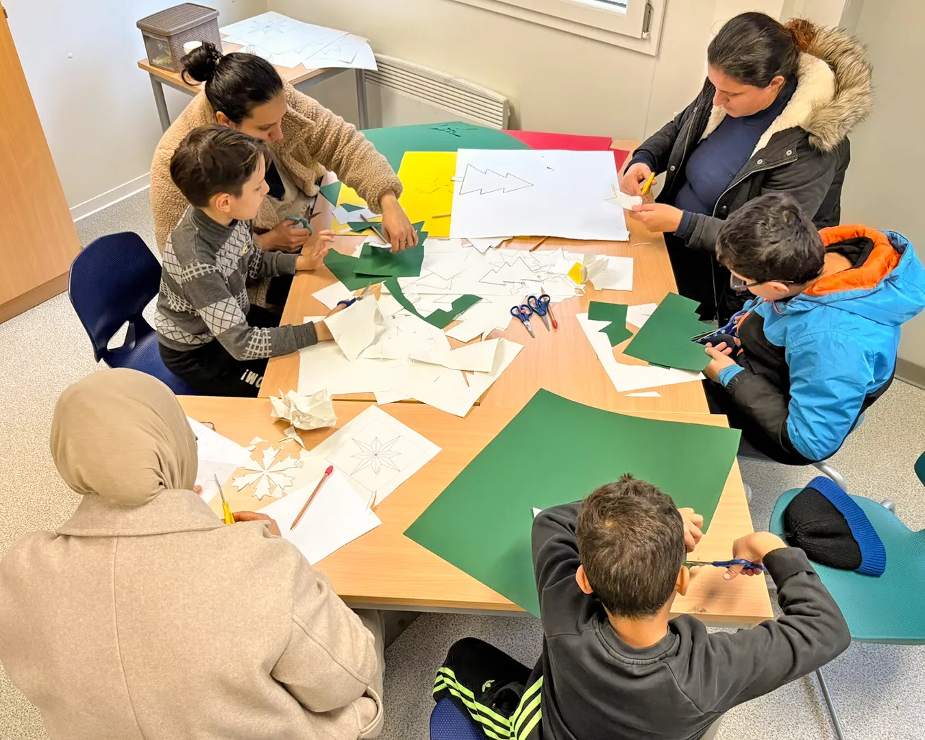 Kinder schneiden mithilfe von Familienangehörigen Tannenbäumchen aus Tonpapier aus.