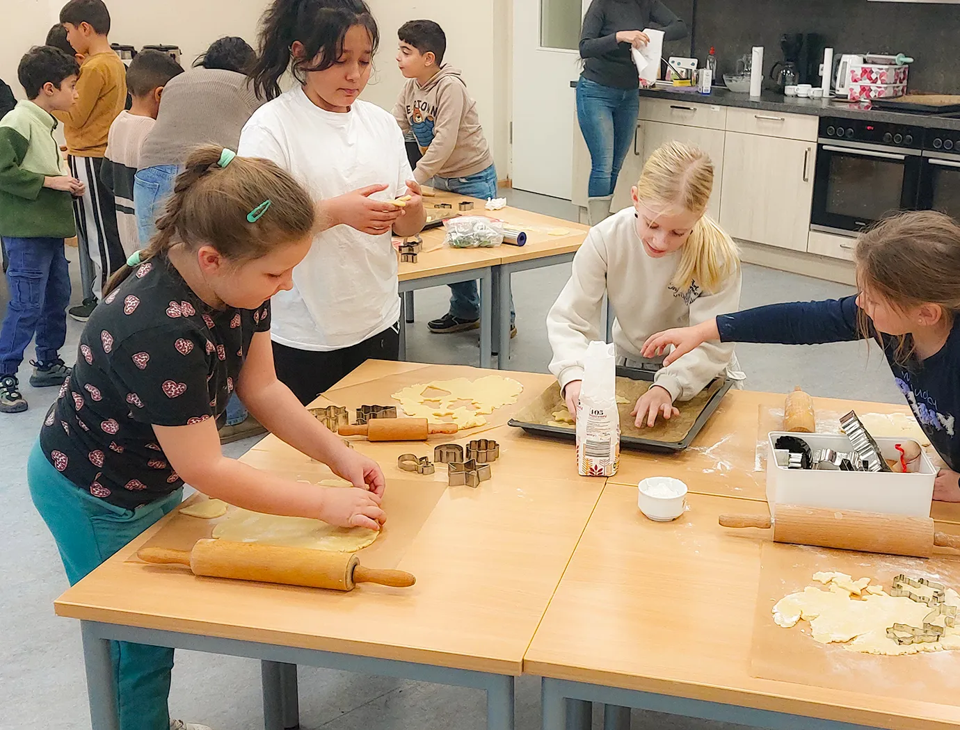 Schülerinnen und Schüler beim verschiedenen Tätigkeiten des Backens.