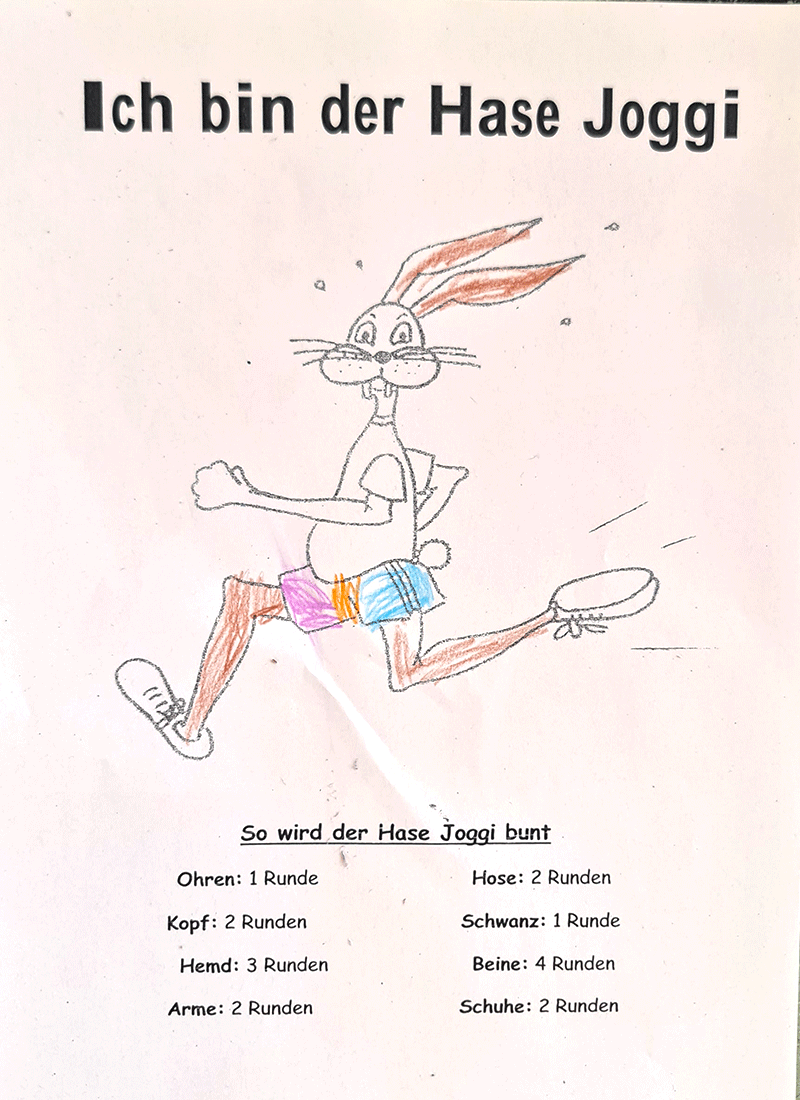 den Hasen Joggi bunt anzumalen. Dazu liefen wir für jedes Kleidungsstück