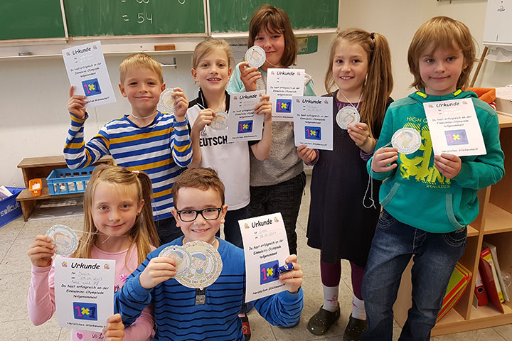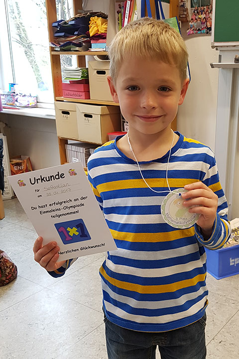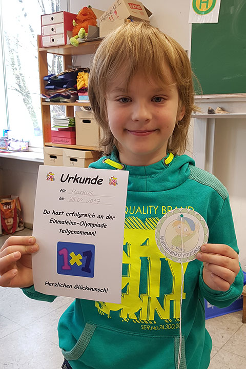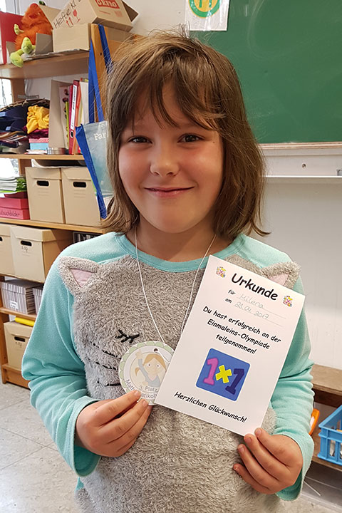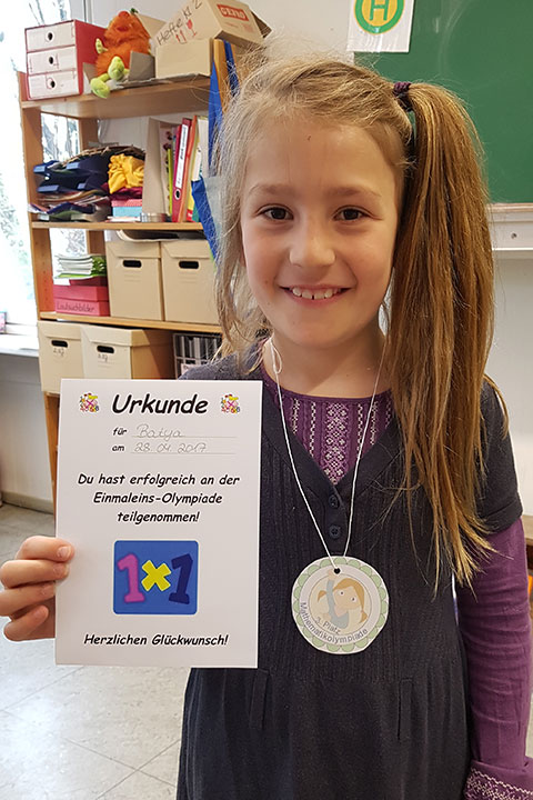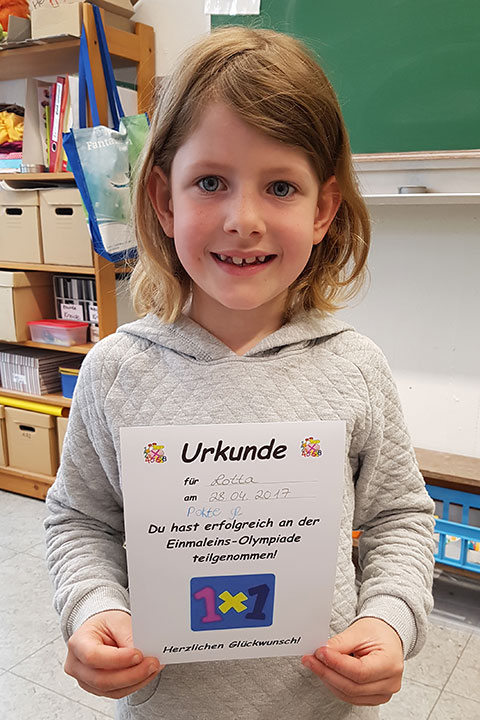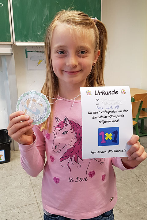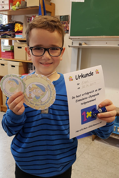 Zum Abschluss unserer Unterrichtsreihe zum Einmaleins fand unsere Einmaleinsolympiade in der Klasse 2a statt. Alle Schülerinnen und Schüler haben mit Begeisterung und viel Ehrgeiz ihr mathematisches Können bei der Olympiade unter Beweis stellen können. Zum krönenden Abschluss gab es für jedes Kind eine tolle Urkunde und für die Erstplatzierten zusätzlich eine Mathematikmedaille. Da hat sich doch das Lernen gelohnt ;-)
